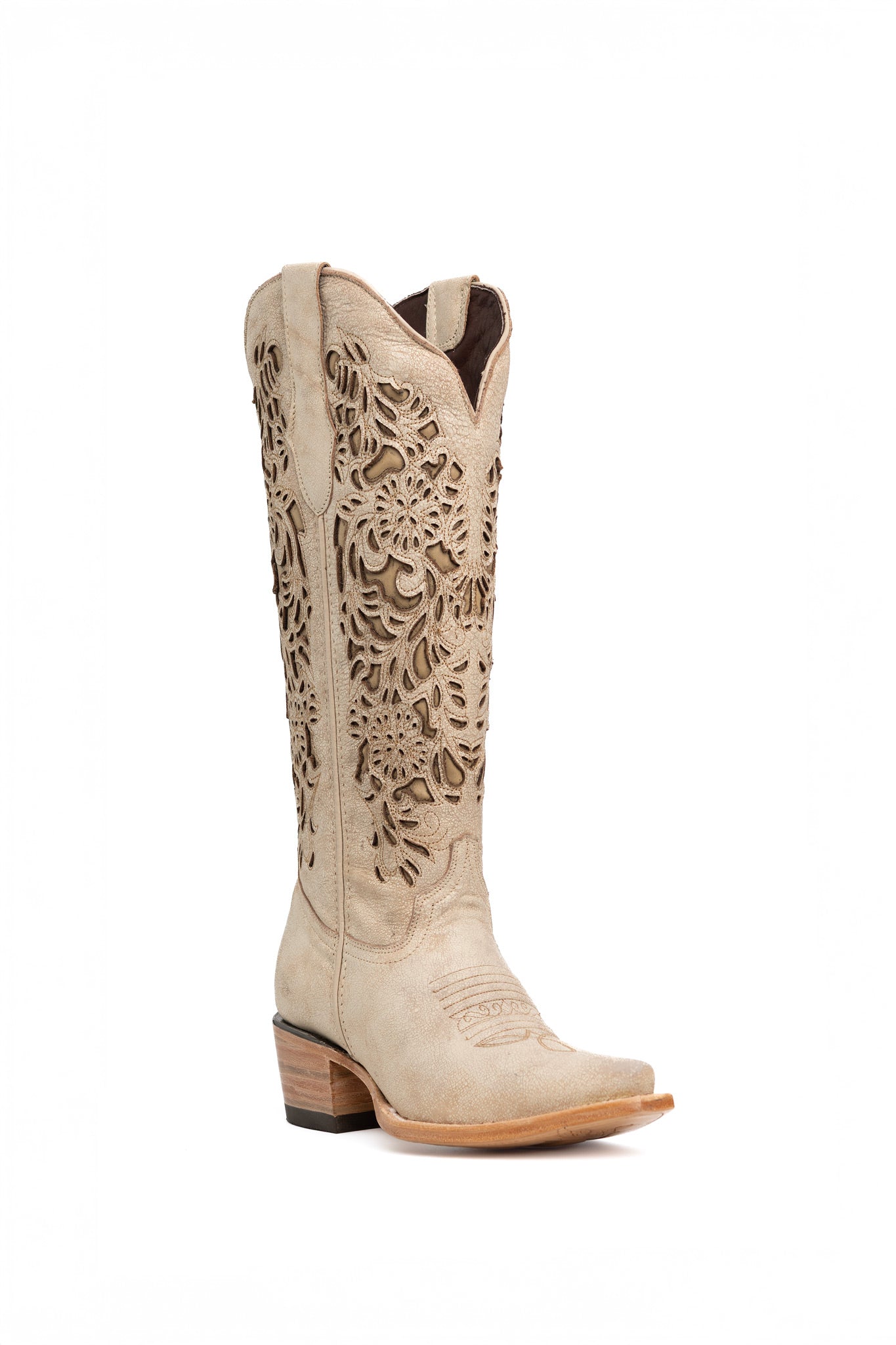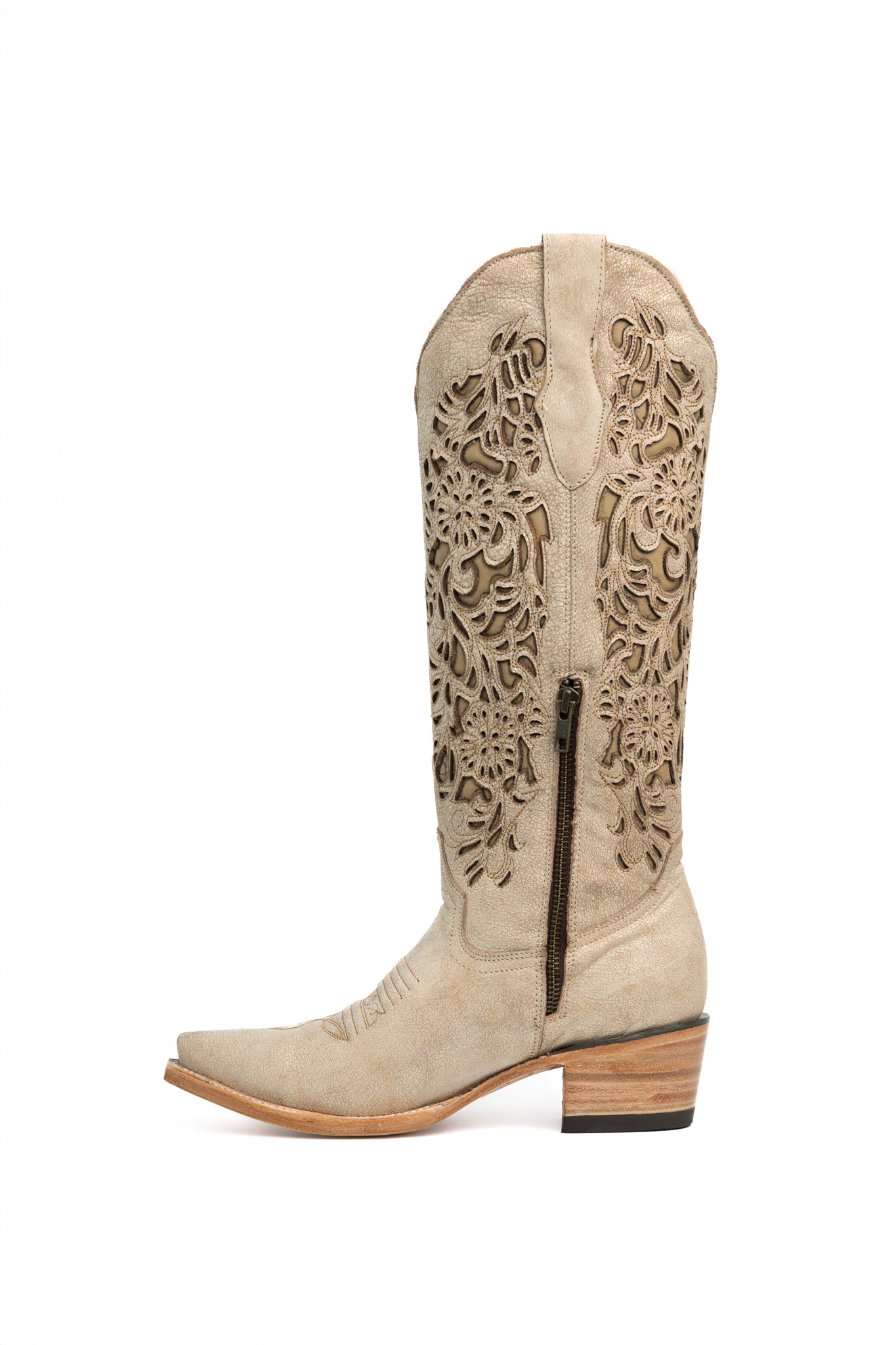 Bota vaquera de piel genuina en tonos claros con acabado sofisticado. Destaca por su tubo con diseño láser resacado que le confiere un carácter distintivo y contemporáneo. Suela de cuero de calidad que garantiza durabilidad y comodidad en cada paso. Elaborada artesanalmente en México, esta pieza combina tradición y diseño moderno, perfecta para quien busca autenticidad y estilo en sus accesorios de calzado.
