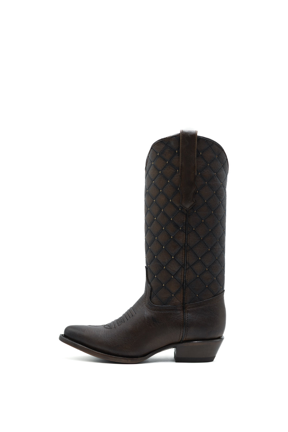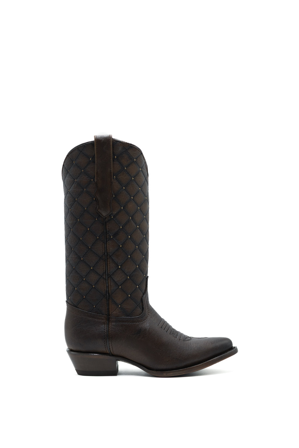 Bota vaquera de piel genuina en color chocolate, confeccionada con maestría artesanal en México. Destaca por su elegante aplicación de estoperoles en el tubo con diseño de rombos que añade carácter y autenticidad. Cuenta con horma ovalada para mayor comodidad y suela de cuero de calidad, garantizando durabilidad y flexibilidad. Perfecta para quien busca una bota tradicional con acabados refinados y construcción sólida.