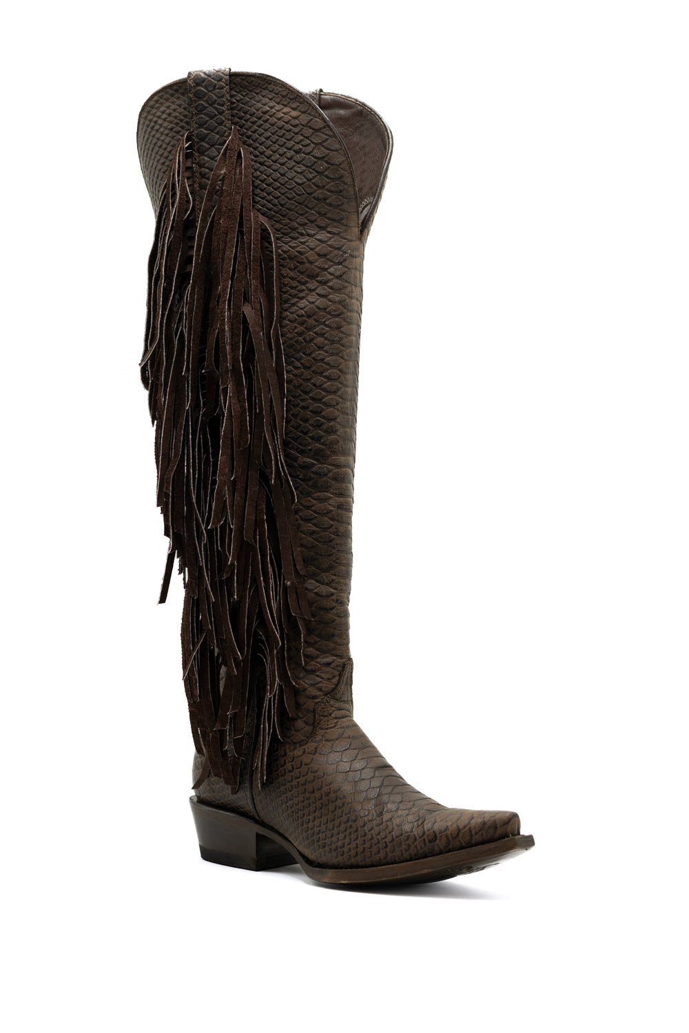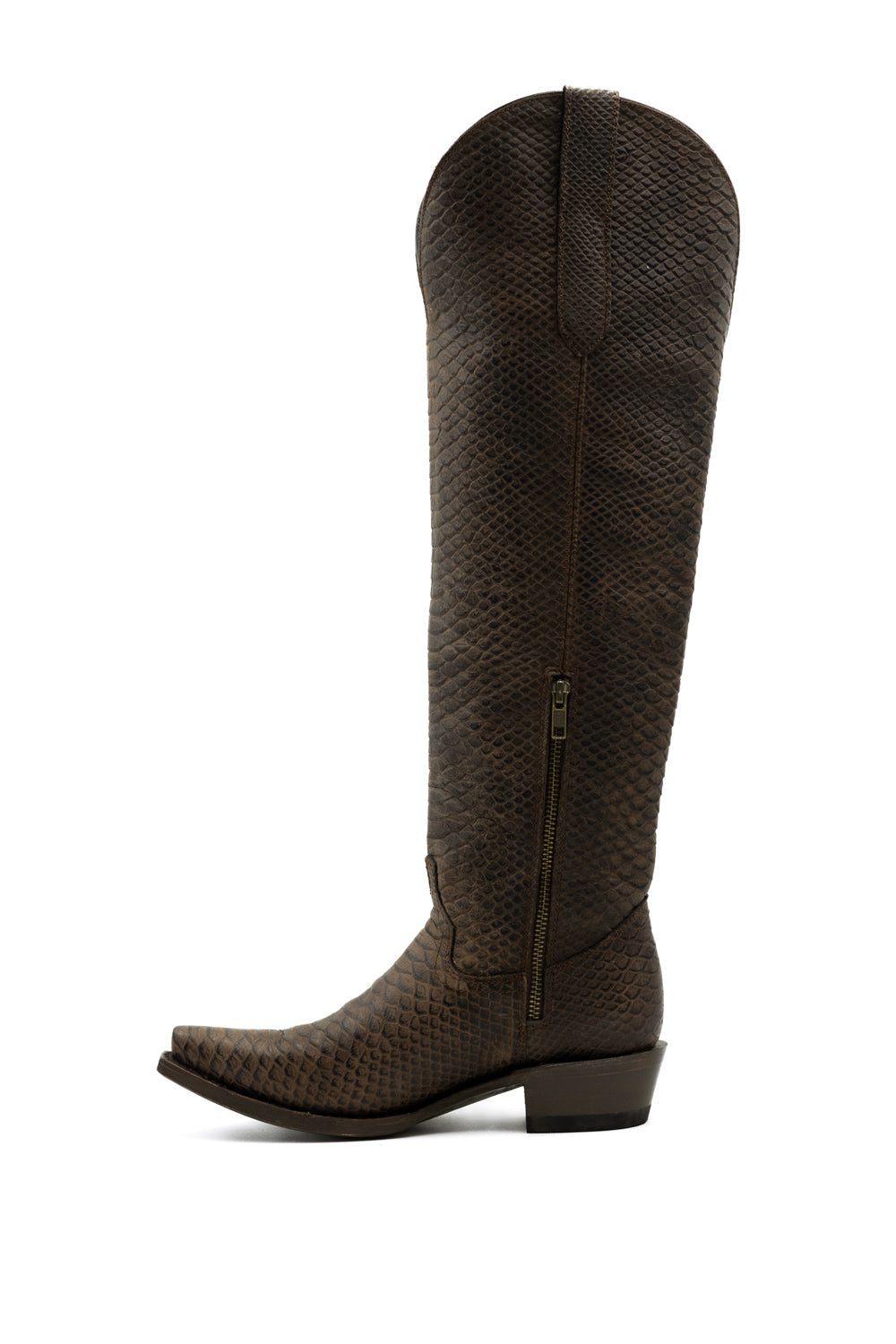 Bota vaquera auténtica con tubo alto y diseño lateral de barbas que captura la esencia del estilo Western clásico. Confeccionada en piel genuina de color moka con grabado de pitón que añade textura y carácter distintivo. La suela de cuero proporciona durabilidad y flexibilidad natural, mientras que su construcción hecha en México garantiza calidad artesanal. Ideal para quien busca una bota de vaquera con presencia y autenticidad, combinando tradición y diseño retro en cada paso.